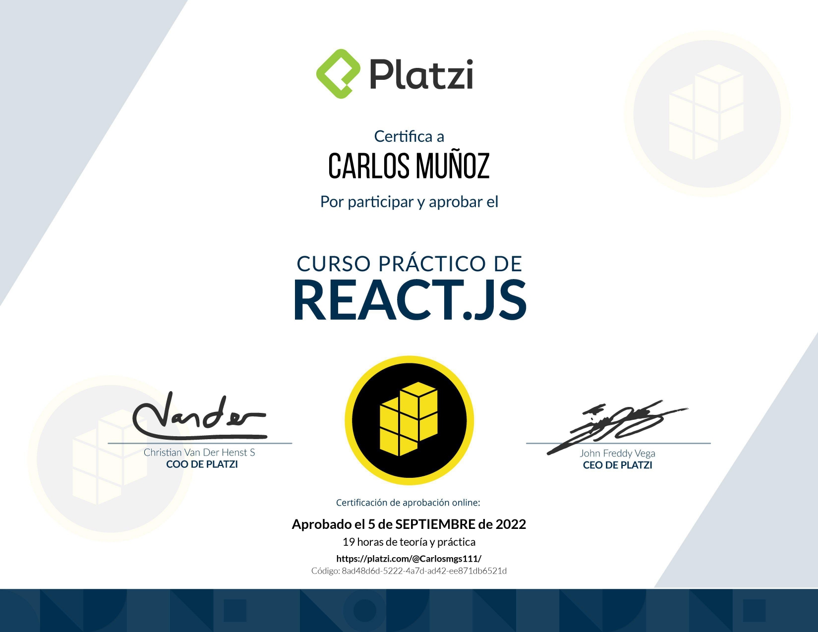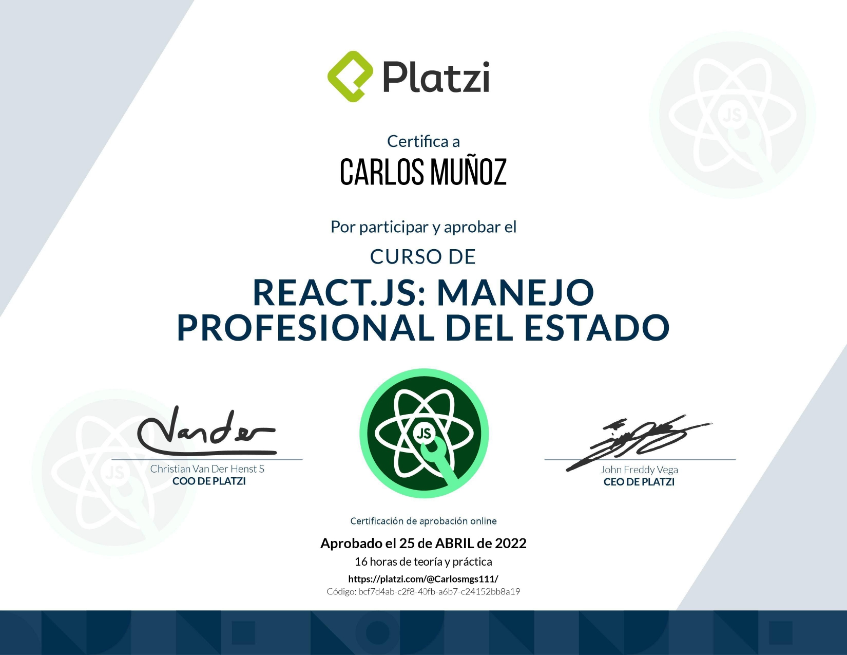 Certificado de finalización del curso React.js: Manejo Profesional del Estado